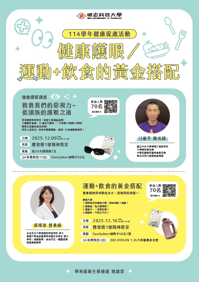 衛生保健組在歲末迎新前辦理健康護眼和運動+飲食講座,歡迎有興趣的同學參加!